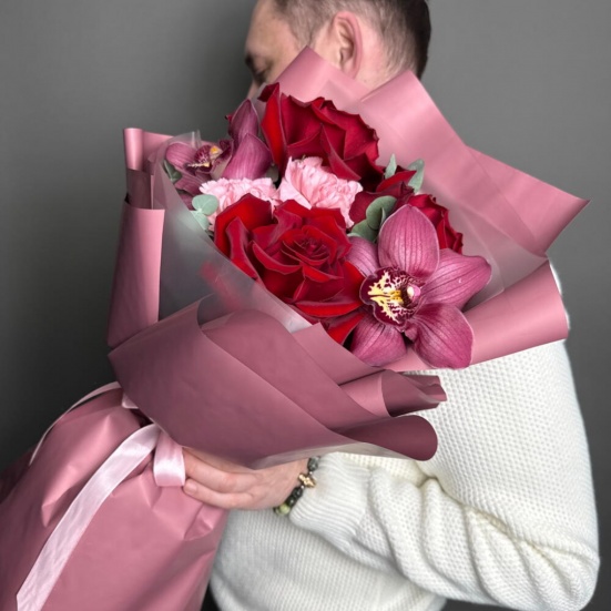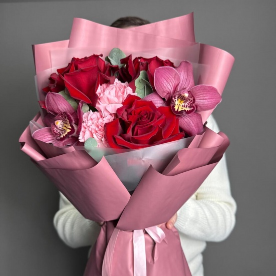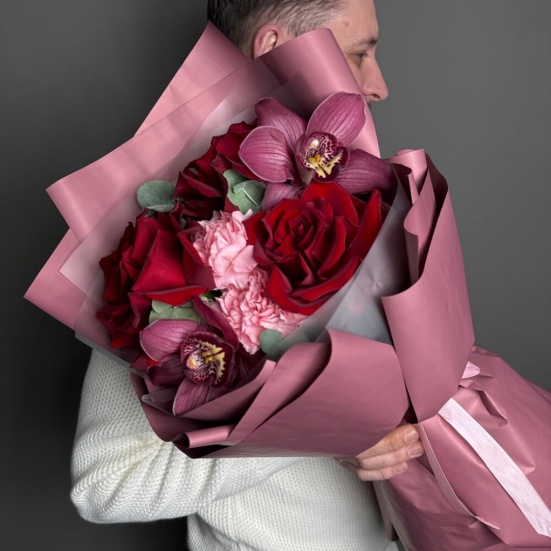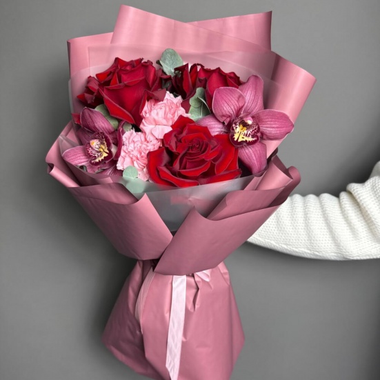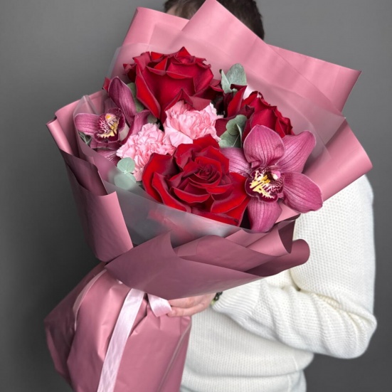 Букет из 3 красных роз, орхидей и диантуса в Сочи