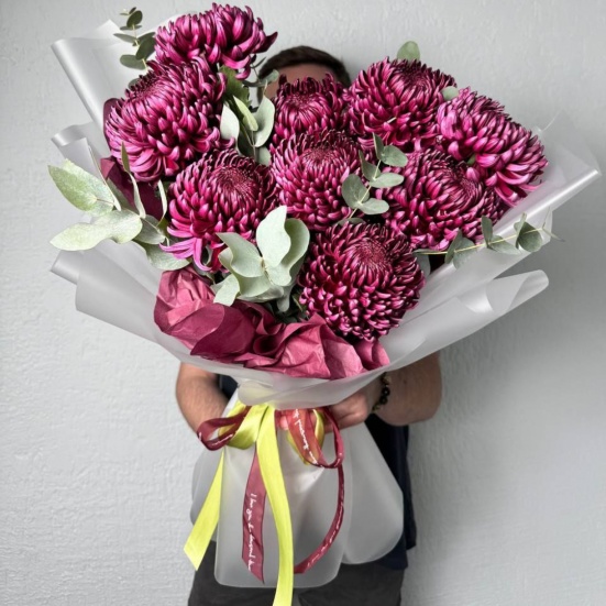 Выразительный моно букет из сезонной стойкой хризантемы "Бигуди" и эвкалипта